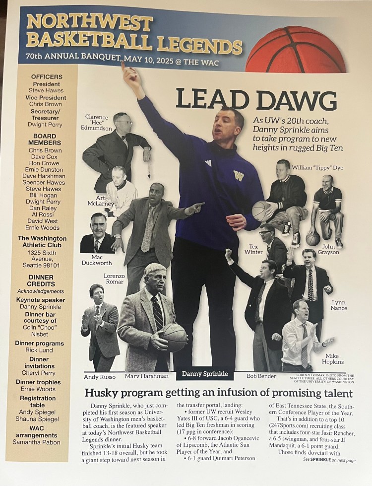 Sprinkle spoke to the 70th meeting of the “Northwest Basketball Legends” at the Washington Athletic Club, bringing renewed hope and optimism to a program that hasn’t sniffed the NCAA Tournament since 2019. But first, Sprinkle spoke candidly about the hole he and his staff were faced to try and dig out of when he was named coach on March 25, 2024 to replaced fired Mike Hopkins.