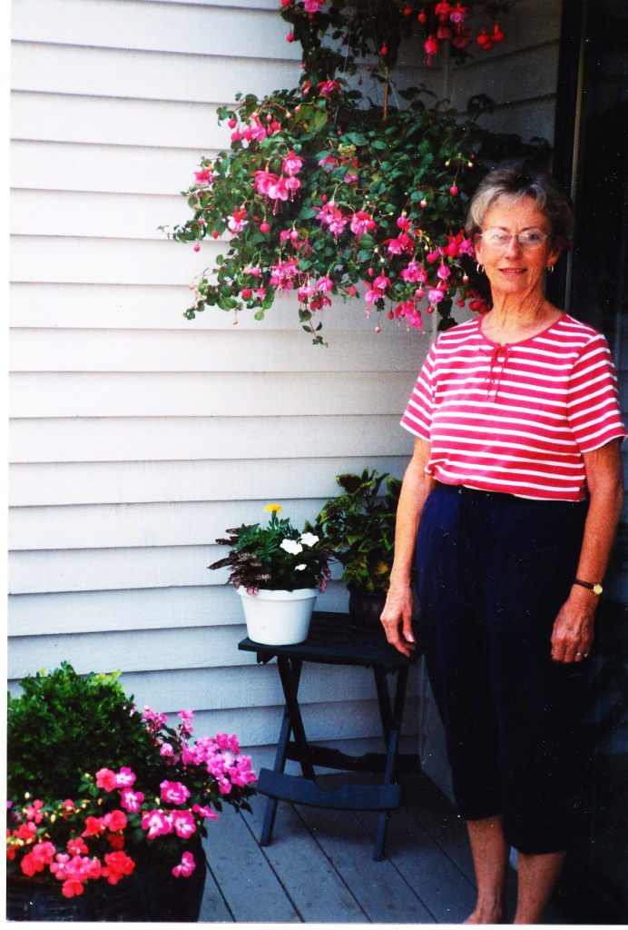 Mom with a hanging fuchsia basket. On the back of the scanned photo she had written I had given her the fuchsia for Mother’s Day.