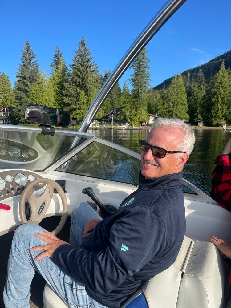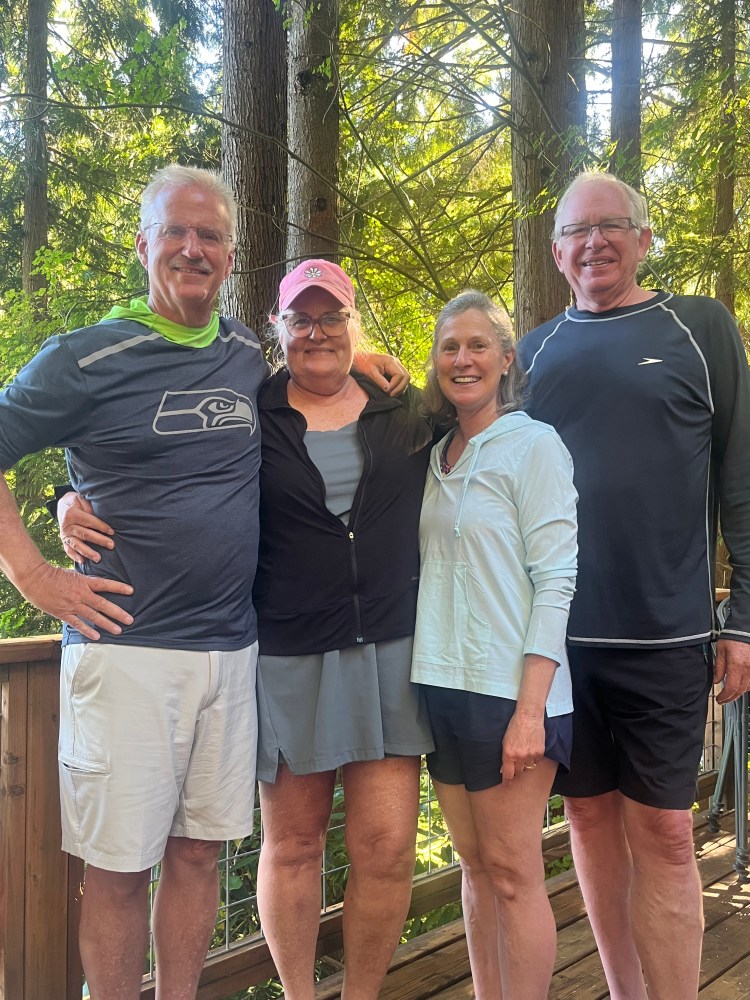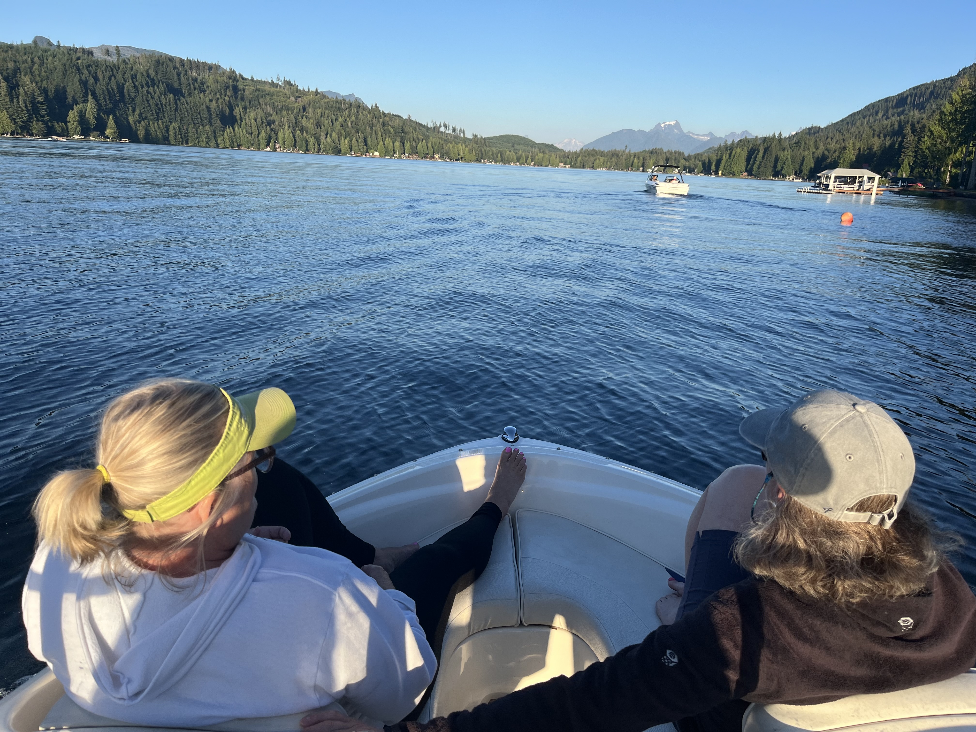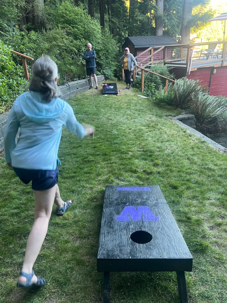 A leisurely, evening cruise around the lake.Peggy throws a bag in the Apple Cup of cornhole, pitting the Swensons (with UW bags) against the Lunds (with WSU bags), complete with Cougar and Husky sound effects. The Swensons cleaned our clocks. But since they were playing with UW bags, I felt like we all won.Longtime friends pose for a photo as our three-day stint at our lake cabin comes to a close.