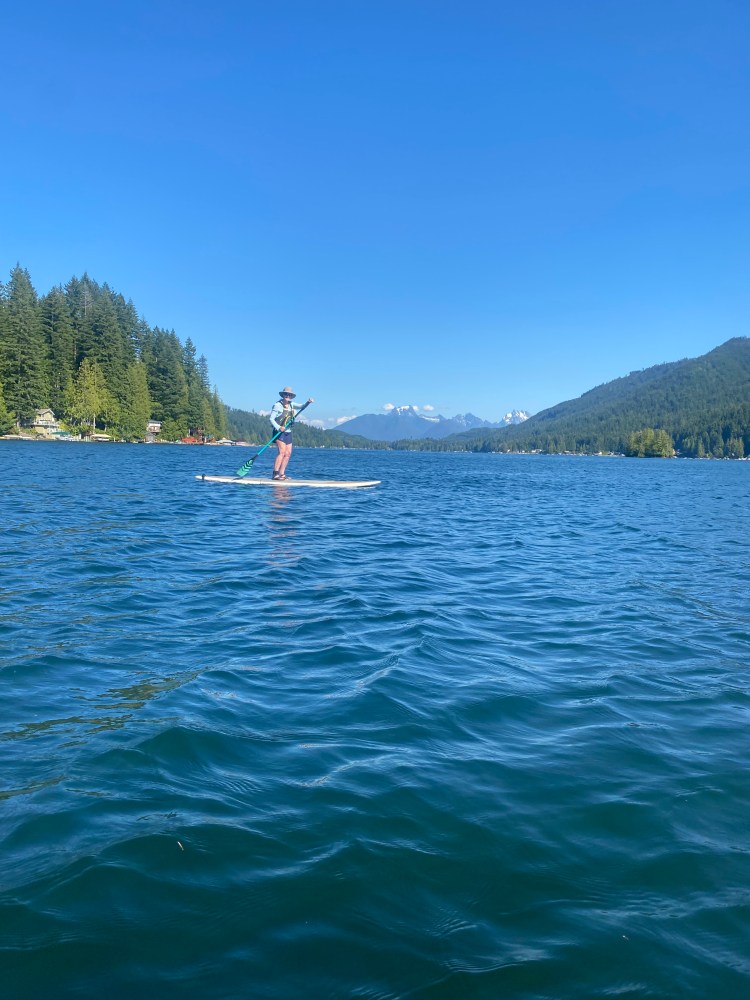 Peggy Swenson paddleboarding on Lake Cavanaugh, with Whitehorse Mountain and Three Fingers in the background.