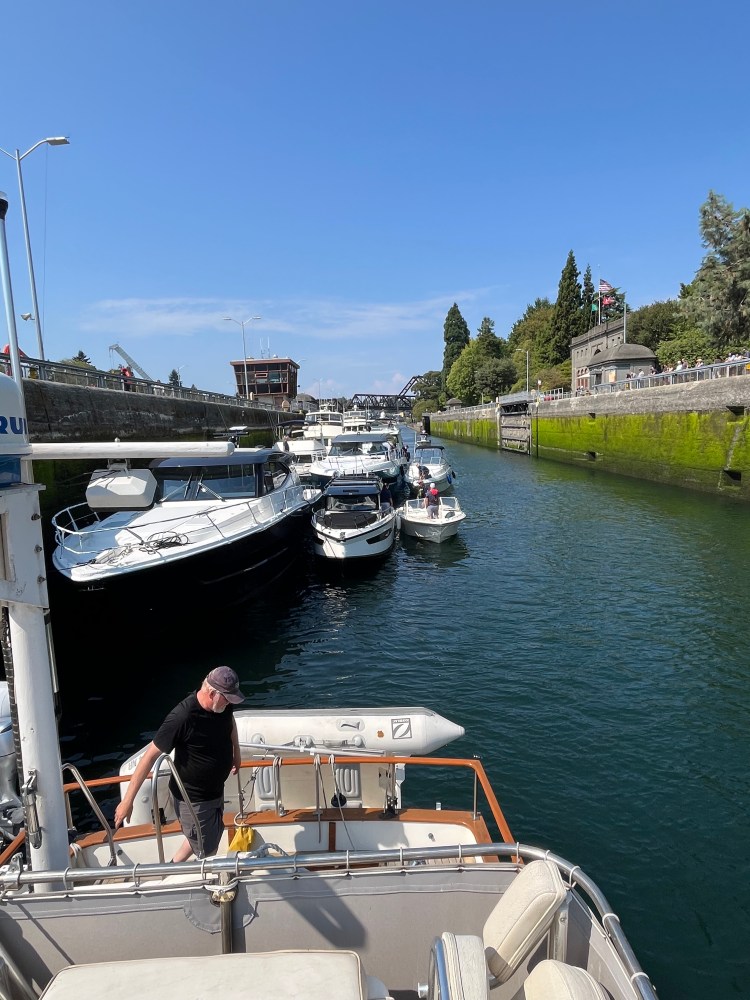 An expensive yacht leaving the Ballard Locks as we waited to enter. He had a Washington State University flag and an Auburn University flag, which was interesting.We passed through the “large” Ballard Locks on our return to Nickerson Marina. The yacht and matching blue “chaser boat” behind us were being delivered to their owner. Kent says as many as 100 boats can fit in the large locks.