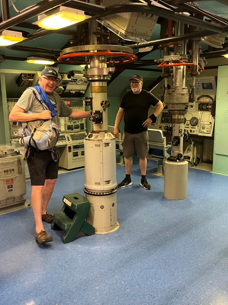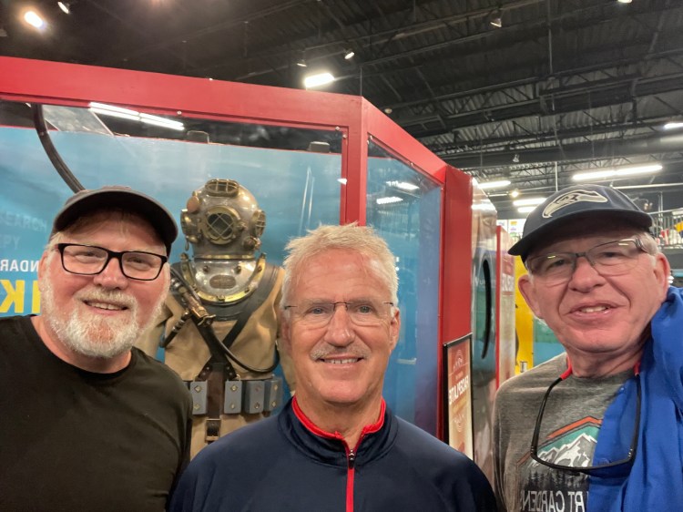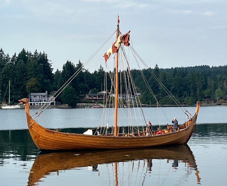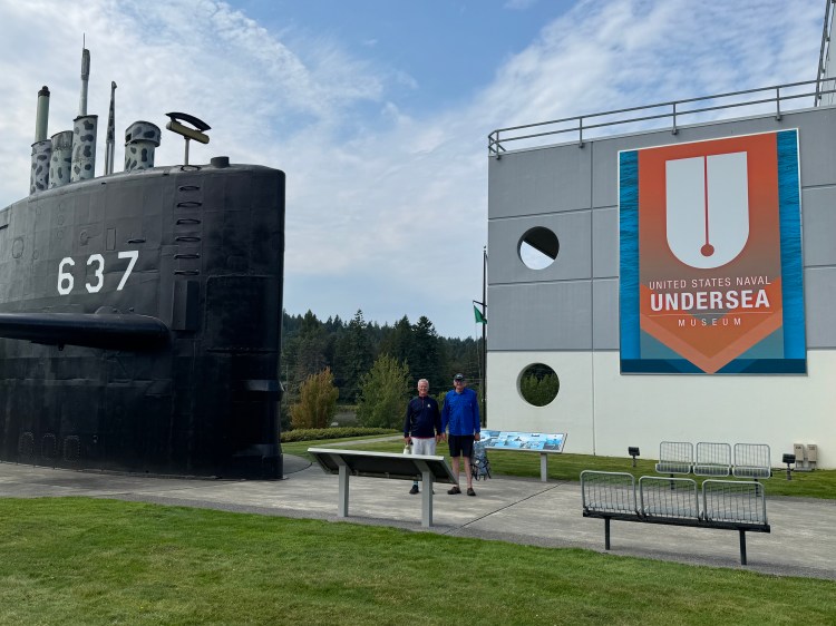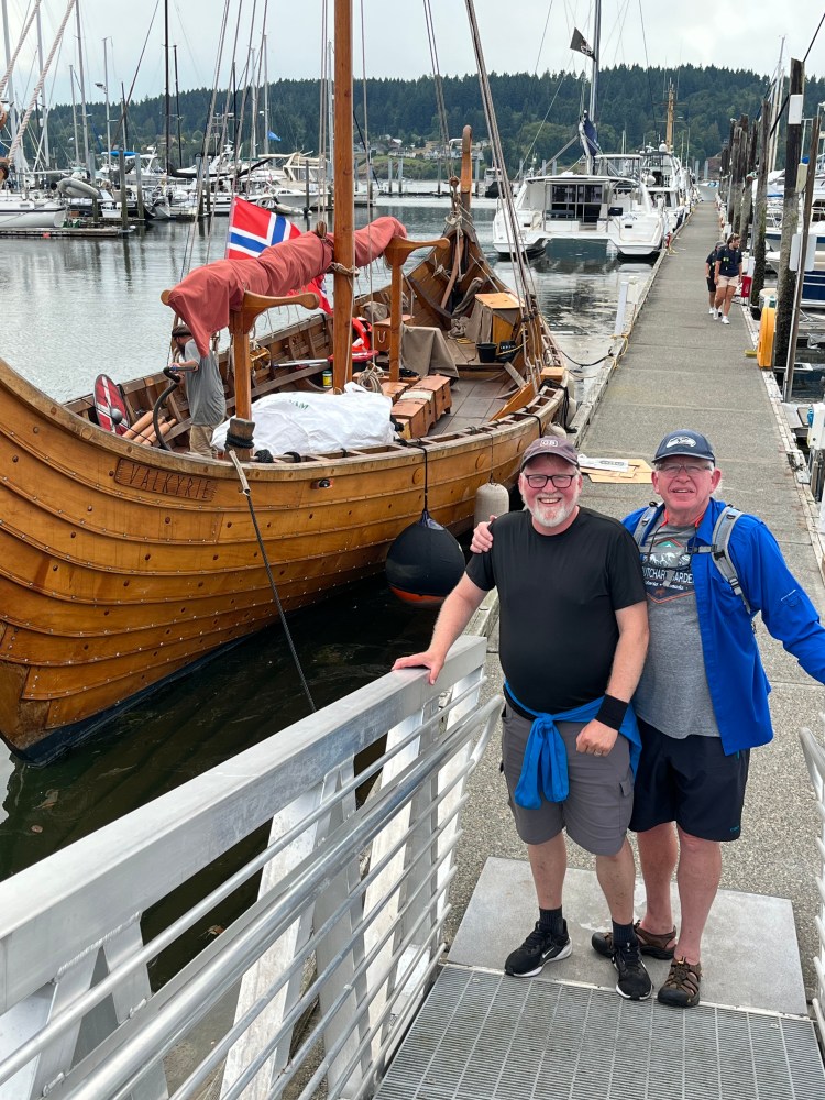 We got a parking spot at Blake Island, southwest of Seattle (background). The marina filled up pretty fast after we arrived. The small boat pulled out, and a yacht Kent said was worth $750,000 pulled up in its place. Tillicum Village over the years has hosted salmon barbecues for tour groups. Vicki and I were here in 1979 for a media event for the Major-League All-Star Game that was played in Seattle. Unfortunately, the tribal village has been closed for the past three years.The trail system on the island. We hiked the four-mile loop trail.We take a break from the hike to survey the scenery on the south end of the island, looking toward both the Vashon and Southworth ferry landings.Kent grilled tri-tip steak for dinner the first day.Dessert and decaf coffee as the sun sets, a perfect setting for meaningful conversations.On our way to Poulsbo, we crossed paths with a Bremerton-bound Washington State Ferry and a smaller, modern “fast ferry” that provides passenger-only service between Seattle, Bremerton and Port Orchard.Approaching Keyport (in the background), and I get a chance to take the wheel.A planned visit on the second day to the United States Naval Undersea Museum in Keyport.The main reason for our visit to the museum was it featured some diver equipment Bob’s father, Bud, wore as a Navy deep sea diver. Bob was excited to see the gear his father used. And it matches the tattoo he has in honor of his father, who died of cancer at a young age, shortly after Bob and Peggy were married.Once again, the threesome, for the obligatory shot in front of Bud Swenson’s gear.Bob and Kent check out what it would have been like to serve on a World War II-vintage submarine.The Poulsbo Marina has a Norwegian flavor. A few of the buildings are painted the colors of the nation’s flag, just like in Norway.A vintage Viking boat in the Poulsbo Marina.The aforementioned Viking ship set sail the next morning, in Liberty Bay.Boys will be boys. Trying to get close to a Heron.And that’s as close as I got before it flew away, but not before he scolded me.Suspect deckhand in the boat cabin.Kent and I on the waterfront with the “Sons of Norway” building in the background.We spent our second night in Poulsbo, which was incorporated in the 1880s. A Norwegian settler suggested it be named “Paulsbo,” after his hometown in Norway. But authorities in the U.S. Post Office in Washington, D.C. misspelled the town’s name, likely misreading the immigrant’s handwritingNight time in Poulsbo. It’s an unique, different lifestyle, this group of boat people who hop from one marina to the next in the Puget Sound during the summer months.Day 3. Heading back to Seattle, and about to pass under the Agate Passage Bridge linking the Kitsap Peninsula to Bainbridge Island.The open water, heading toward Shilshole Bay and the Ballard Locks.