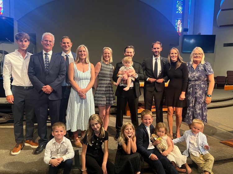A brief ceremony at the gravesite, before the memorial service, with Rev. Dwight Nelson officiating.Our family, shown here in the Bethany Covenant sanctuary after the memorial service and reception. Great grandson Isaac, top row, far left, read scripture. Granddaughter Greta, top row, second from right, and yours truly were the speakers.Mom and dad’s headstone at a cemetery at Freeborn Lutheran Church east of Stanwood. Mom’s parents, Morris and Sylvia, are buried next to them.