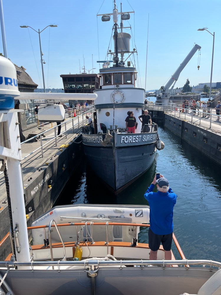 Approaching the “small” Ballard Locks on our way to saltwater. The water level of the Salmon Bay Waterway, Lake Union and Lake Washington is higher than the Puget Sound.Waiting for the water level to drop in the “small” locks, Bob takes a picture of the surveyor boat behind us. I didn’t any “forests” in the ocean.