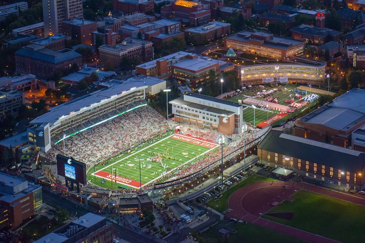 An aerial photo of cozy Martin Stadium, home of the Washington State Cougars, in Pullman. The Compton Union Building is just beyond the Cougar Football Complex behind the west end zone, and the Terrell Library behind that.