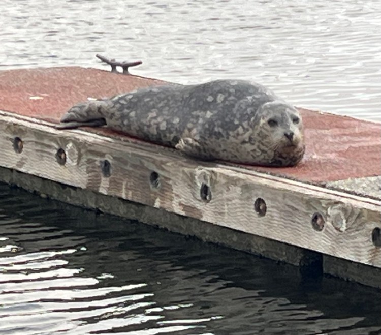 The fishing boat (in the background), also known as a “purse seiner,” releases a small but powerful “skiff boat,” which drags a wall-like net, eventually closing the loop at the fishing vessel to collect fish.We saw seals in the water and on marina docks. We worried beforehand we wouldn’t get a spot at the marinas at Blake and Poulsbo. You could say these critters helped “seal” our reservations.
