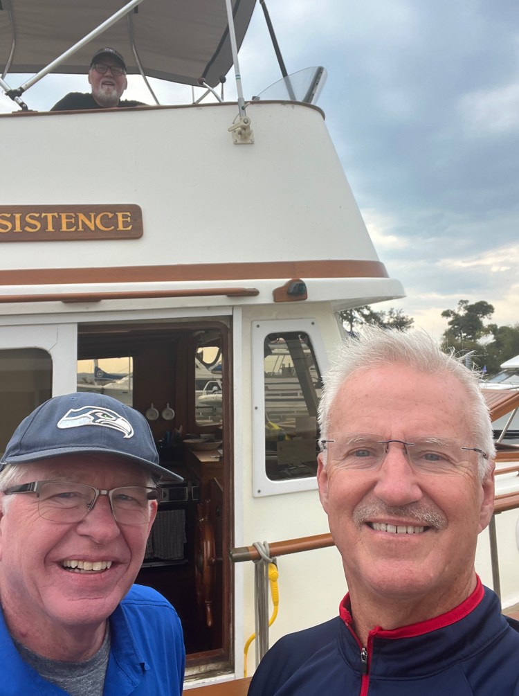 A familiar trio on a three-day boat trip: Myself, Kent Oldenburger and Bob Swenson in front of Kent’s 35-foot Trawler “Persistence” at the Blake Island Marina in Puget Sound.