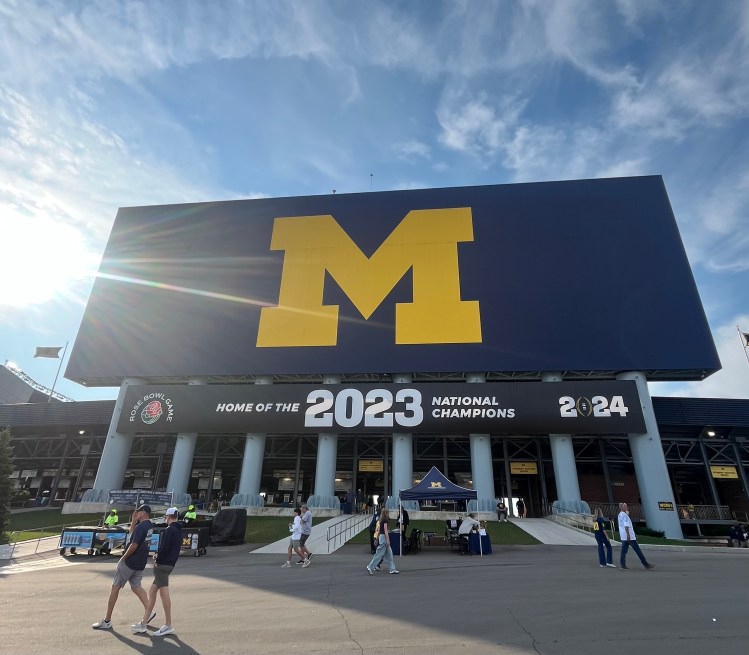 BIG-TIME BRAND: Michigan’s iconic blue and maize winged helmets. A sea of maize in the stands. Two massive video scoreboards at the north and south ends of the stadium, each emblazoned on the back side with a giant, block “M.”