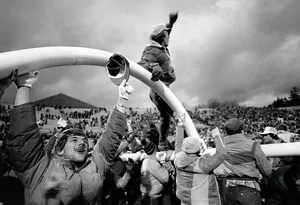 Cougar fans tear down the goal post after WSU stunned heavily-favored UW in the 1982 Apple Cup. The students eventually carried the goal post out of Martin Stadium and dumped it into the Palouse River.