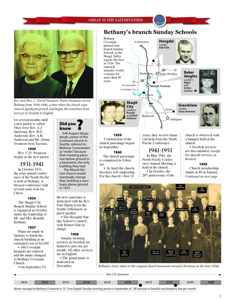 When Bethany turned 50 and 75, the church had compiled historical timelines as a part of commemorative anniversary booklets. As we drew closer to the 100th anniversary, it was apparent no one had updated the timeline since the 75th, in 1996. I was able to do that, with help from former and current staff. Previous timelines were text only. Being a visual journalist, I envisioned a timeline illustrated with photos and graphics. Here’s the first three pages of the 12-page booklet.