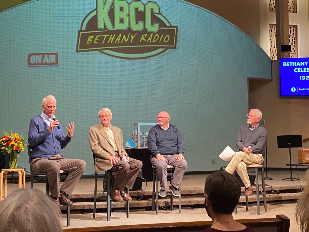 Steve Elde, far right, interviews three of BCC’s former pastors who are still living, From left, Dwight Nelson, Gary Peterson and Kent Egging. Gary was my pastor when I was in junior high and high school. If not for Gary, I probably wouldn’t have gone to North Park University, where I met Vicki. I had already been accepted to Seattle Pacific College and was definitely headed there when Gary coaxed me to attend the Chicago school. In the background is Don Wick in the KBRC “radio broadcast booth.”